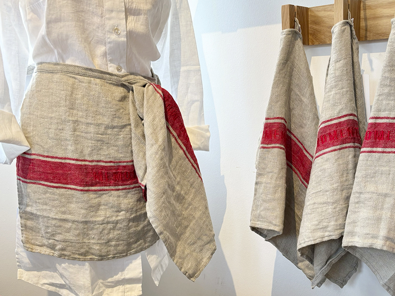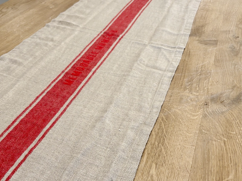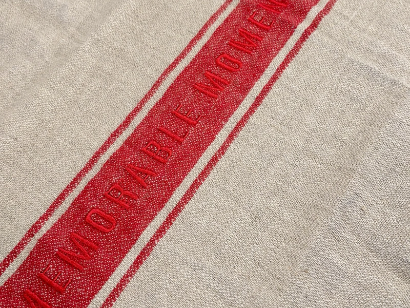 Vores nye kollektion, naturfarvet jacquard vævet hør med røde striber i midten samt et broderi “Memorable Moments”