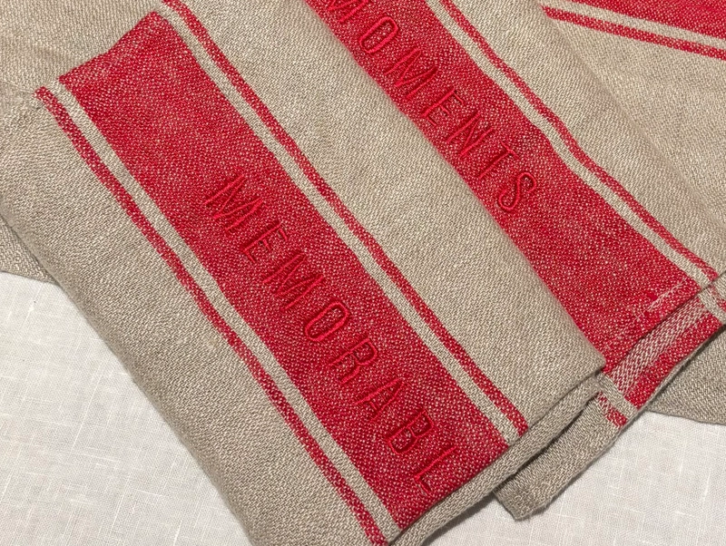 Vores nye kollektion, naturfarvet jacquard vævet hør med røde striber i midten. “Memorable Moments” vævet ind i stoffet – skabt netop til det.